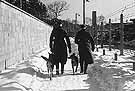 Two SS guards and their highly trained German shepherds patrol the snow-laden perimeter of the concentration camp at Sachsenhausen, Germany. Electrified fences, specially trained police dogs, and armed guards made escape nearly impossible. Attempts to break out of the camp were further discouraged by the fact that if one was caught, execution was certain.