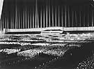 The Zeppelin field in Nuremberg became the center of the annual Nazi Party rally. Hitler and other leaders of the Third Reich gathered there before a mass audience designed to show the popularity of the regime. The impressive light dome, designed by architect Albert Speer, added an awe-inspiring spectacle to the assembly. One hundred and thirty searchlights illuminated the night sky to a height of 25,000 feet.