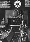 National Socialists objected to any secret society, especially the Masons. The Nazis viewed such groups, which could not be controlled by the state, as tools of the imagined international Jewish conspiracy. This fanciful reproduction of a Masonic altar was constructed for The Eternal Jew exhibition that opened in Munich on November 8, 1937.