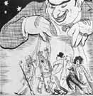 Promoting the caricature of the Jew as puppet master, this cartoon from a Budapest, Hungary, antisemitic publication played on people's fears and animosities. The rich Jew is pictured as manipulating all society. Under racist Prime Minister Gyula Gömbös, who controlled the government from 1932 to 1939, Hungary pursued a policy of economic and political cooperation with Germany. In May 1938 Hungary, following the German example, enacted a law restricting Jewish participation in the country's economic life.