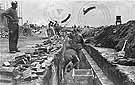 An SS officer intently observes the forced-labor operations at the Neuengamme concentration camp in Germany. As was the case with many camps, the first prisoners were responsible for constructing the facilities. The site at Neuengamme was selected because of the abandoned brick factory that was part of the complex. The SS wanted to reactivate the factory and use the bricks to supply the public structures being planned for Hamburg.