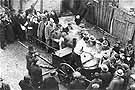 Jewish deportees line up for soup at a mobile cooking facility in the Zbaszyn, Poland, refugee camp. Nearly 6000 Jews arrived in Zbaszyn during the first two days of the expulsion. Initially, the refugees were provided with warm water and food by local residents, but since the crisis lasted several months, the Joint Distribution Committee sponsored an organized relief effort. After high-level governmental talks, Polish and German officials finally agreed to allow Jewish deportees back into Poland after they had returned to Germany to liquidate their assets.
