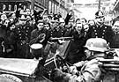 A crowd of sullen-faced Czechs looks on as German motorized divisions enter Prague on March 15, 1939. The occupation of the remaining independent Czech lands openly violated the accords reached at the Munich Conference six months earlier. At those meetings, Hitler had assured the naive prime minister of Britain, Neville Chamberlain, that he had no desire for further territorial expansion. The fact that no nation took forcible action against his moves in Czechoslovakia greatly emboldened Hitler.