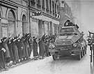 German inhabitants of Memel salute a German armored column as it enters the city in late March 1939. A part of East Prussia since the 16th century, Memel and its environs were removed from Germany in 1919 and annexed by Lithuania in 1923. After assuming power in 1933, Hitler agitated for Memel's return to Germany. Before sending troops into Memel, the Nazi Party gradually seized control of local politics by supporting the efforts of Dr. Ernst Neumann.