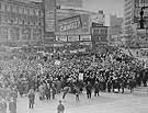A crowd of 10,000 men, women, and children gathers at Columbus Circle in New York City to listen to speakers condemn the recent German takeover of Czechoslovakia. Many of the crowd were dressed in native Czech costumes and had participated in a "Stop Hitler Parade" held earlier in the day. Nazi activity in Europe polarized Americans of European descent. While those of Jewish, Czech, and Polish heritage campaigned against Hitler, many within the German-American communities supported the Nazi government before the outbreak of war in September 1939.