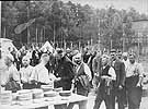Inmates at the Stutthof concentration camp in Danzig, Poland, line up for food. Designed to house "civilian prisoners of war," the Stutthof camp was populated by Jews and other opponents of the Nazi regime. As the German military campaigns moved eastward and more concentration camps were built, the Nazis employed the methods that they had perfected in Germany during the preceding six years. Prisoners were collected, shipped to selected sites, and forced to build the camps' infrastructures.