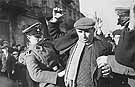 An SS officer searches a Jew on Grzybowska Street in Warsaw, Poland, as part of a raid for weapons in a Jewish neighborhood. The raid was staged to "prove" that Jews were hiding weapons to use against the German Army. Once ensconced in Poland, the Nazi propaganda machine worked overtime to reinforce anti-Jewish prejudices already present in Polish society.