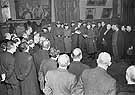 The newly formed Judenrat (Jewish council) of Warsaw, Poland, receives its instructions from SD officials. The Jewish councils, comprised of community leaders, were charged with carrying out the orders issued by the Nazis. They were responsible for supplying the Nazis with laborers, allocating housing assignments, collecting taxes, and, eventually, filling deportation quotas. Judenrat leaders were in a catch-22: Failure to comply with their orders meant death at the hands of the Nazis, while compliance facilitated efforts to eradicate the Jews.