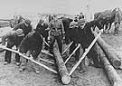 Poles in Grudziadz construct bridges for the Reich Labor Service. Nazi Germany made extensive use of slave labor throughout the conquered territories in Eastern Europe. Almost invariably, Jews were given the most strenuous jobs and the smallest rations. Hence, the number of deaths among Jewish workers was always higher than for non-Jews.