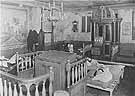 Cots surround the bima of the synagogue at 27 Nalewki Street in Warsaw, Poland. Overcrowding, hunger, and disease dominated Jewish life as the Germans moved some 90,000 Jews from other areas of Poland into Warsaw. These conditions worsened in October with the formation of the ghetto. Some 30 percent of the population lived in less than 2.5 percent of the city.