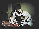German hygienist Sophie Erhardt checks the eye color of a Gypsy woman during a racial examination. Nazi race science classified humans according to the color of one's eyes and skin, and by body measurements. The Gypsies, who originated in India and traveled to southeastern and east-central Europe through Iran, were readily identifiable by their dark skin and eye color. The Nazis viewed the Gypsies as a threat to "pure" Nordic society and subjected them to relocation and extermination policies.
