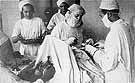 In what is almost certainly a propaganda photo created by the Nazi overseers of the Lódz Ghetto, Jewish surgeons and nurses operate on a patient. The actual state of ghetto health care was considerably more primitive.