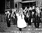 On the eve of the June 6 D-Day invasion, Jewish men gather on the steps of the synagogue at the Brooklyn (New York) Hebrew Home and Hospital for the Aged. Wearing prayer shawls and blowing the shofar (ram's horn) to call people to gather for prayer, these elderly Jews pleaded for a speedy Allied victory that would end the Nazi reign and bring an end to the suffering of the Jews of Europe.