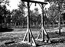 The gallows at Vught, Holland, dominate the landscape, symbolic of the harsh turn the transit and work camp took in 1943 when SS-Sturmbannführer Adam Grünewald became commandant. Belgian and Dutch partisans were hanged from the gallows. The number of prisoners at Vught steadily decreased from mid-1943 as the Nazis sought to kill all Jews interned there. From a high of 8684 Jewish prisoners in early May 1943, the camp's Jewish population stood at less than 500 by the early summer of 1944. Most of Vught's Jews were deported through Westerbork to their deaths at Auschwitz and Sobibór.