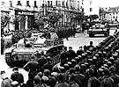 German tanks roll through the streets of Banská Bystrica, Slovakia, while German and pro-Nazi Hungarian soldiers line the street. Deportations of Jews, which had been halted in October 1942, were renewed following the failed uprising in the fall of 1944 against the Hlinka Guard and the Nazis. While some Jews managed to hide, others were discovered and killed. More than 13,000 were sent to Auschwitz and other camps.