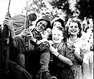 Celebrating the long-awaited liberation of Paris on August 25, 1944, jubilant young women embrace an Allied soldier. Speaking to the citizens of the capital, General Charles de Gaulle, leader of the Free French forces, proudly proclaimed: "Paris broken, Paris martyred, but Paris liberated by her own people."
