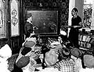 A Jewish Brigade soldier teaches children Hebrew at the Rinshonim hachshara (agricultural training farm) in Bari, Italy, near the Adriatic Sea. The first of the training farms in Italy, Bari and those that followed sought to prepare refugees and survivors for a new future in Palestine. Reaching Italy in November 1944, the soldiers of the Brigade would take part in the final Allied offensive the following spring.