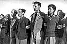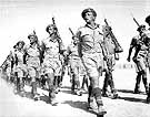 Still in civilian dress, a group of recruits joins the Jewish Brigade at Meir Park in Tel Aviv, Palestine. Wearing armbands designating them as "volunteers," they seek to join Jewish forces already sent from Palestine a month earlier to fight in the Italian campaign. Some members of the Armée Juive, the Jewish Resistance in France, had already fled across the Pyrenees to Spain the previous year, intent on making their way to Palestine to continue the fight for freedom.