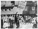 A German Jew is forced to carry a sign that says he had "ravaged a Christian girl." The public humiliation of Jews was the Nazis' first step to systematically removing them from German society. SA members also cut the beards off Jewish men and forced wealthy Jewish women to scrub the streets with their undergarments.
