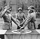 Placing one hand upon the Nazi flag and raising the other in obedience, these German soldiers swear their allegiance to the Führer. With President Paul von Hindenburg's death, Hitler consolidated power by joining the offices of chancellor and president. He solidified his position by requiring that all soldiers swear a personal oath of loyalty to him as Führer.