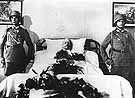 Flanked by Army officers, Paul von Hindenburg, twice elected president of the Weimar Republic, lies in state in his simple room at Neudeck, East Prussia. With the death of the 87-year-old president on August 2, Hitler moved immediately to claim absolute power as Führer. Senile and under the sway of advisors, the field marshal and hero of the Battle of Tannenberg had proven no match for his ambitious chancellor.