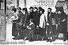 The year 1935 witnessed a series of violent pogroms in Poland, a country long notorious for its vicious antisemitism, deeply rooted in Polish Catholicism. In response, many Jews fled the country. This greeting card celebrating the Jewish New Year portrays some of the thousands of Polish Jews who emigrated to Israel in spite of severe restrictions imposed by the British, who held the mandate on Palestine.