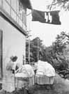 It was important to Nazi officials that those who cared for German children were themselves of Aryan ancestry. This student nurse, or Àlittle blonde sister,À was painstakingly screened before being permitted to look after these infants. The Nazi flag, and banner with SS runes, bring a spooky irony to this otherwise idyllic scene.